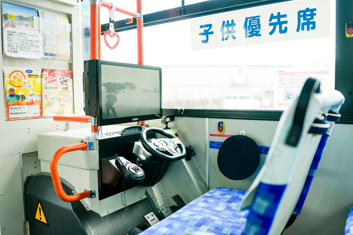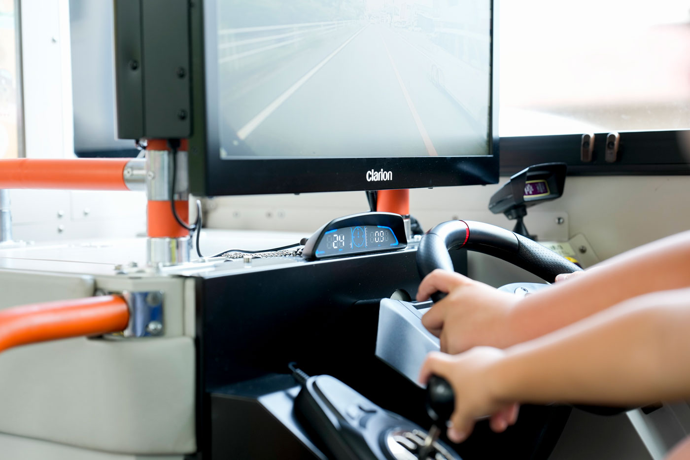 バスの前方には専用カメラが設置され、走行中の景色がモニターにリアルタイムで映し出されるため、臨場感抜群!子どもたちは走行中の外の景色を見ながら、思いっ切り「なりきり運転士」を体験できるというわけだ。もちろん、どれを操作しても実際の運行には全く影響しない。