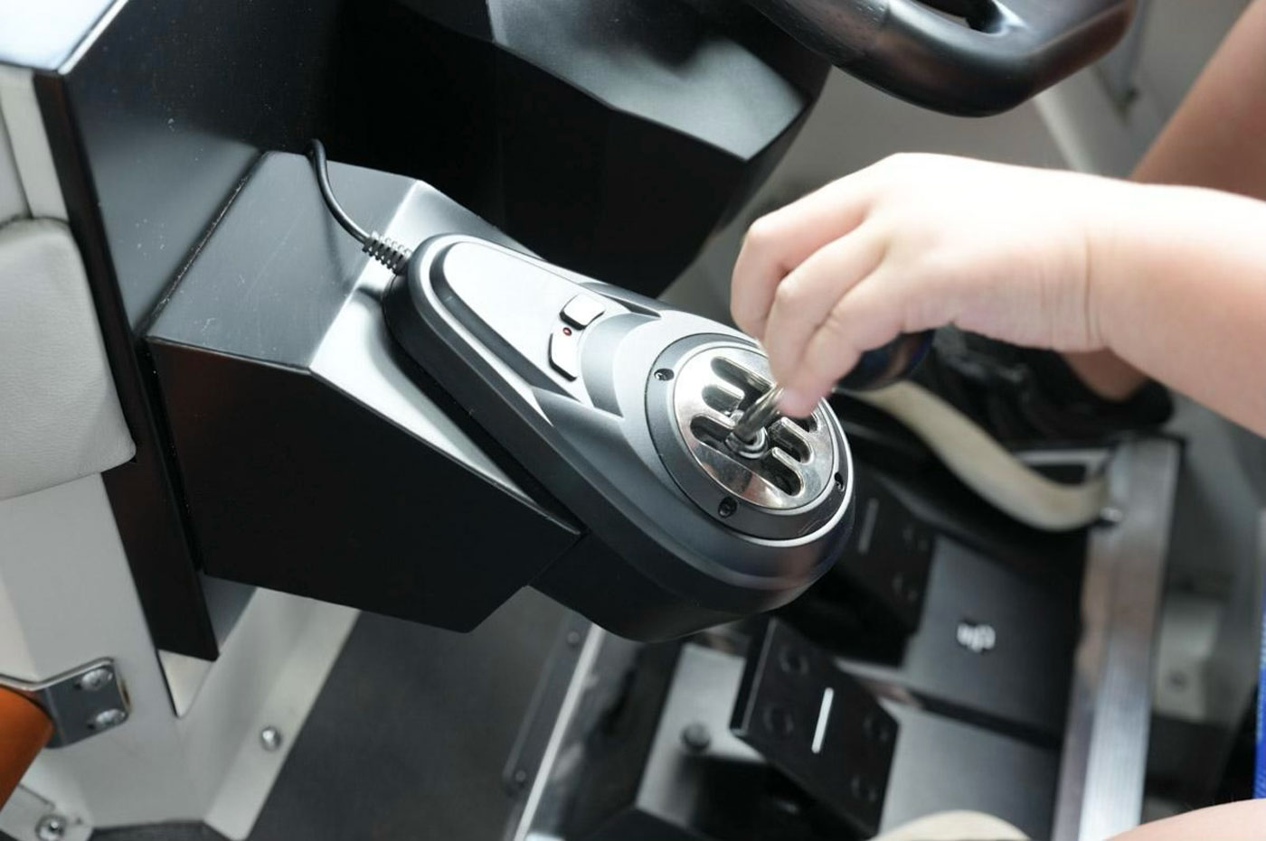 ハンドルやペダル、シフトレバーは、実は市販のレーシングシミュレーター用デバイスを活用しています。ハンドルは、家庭用ゲーム機の製品を流用しているのですが、これが非常にしっかりした作りなんです。