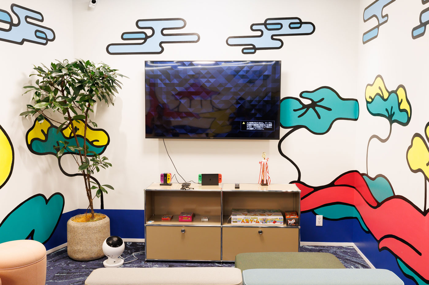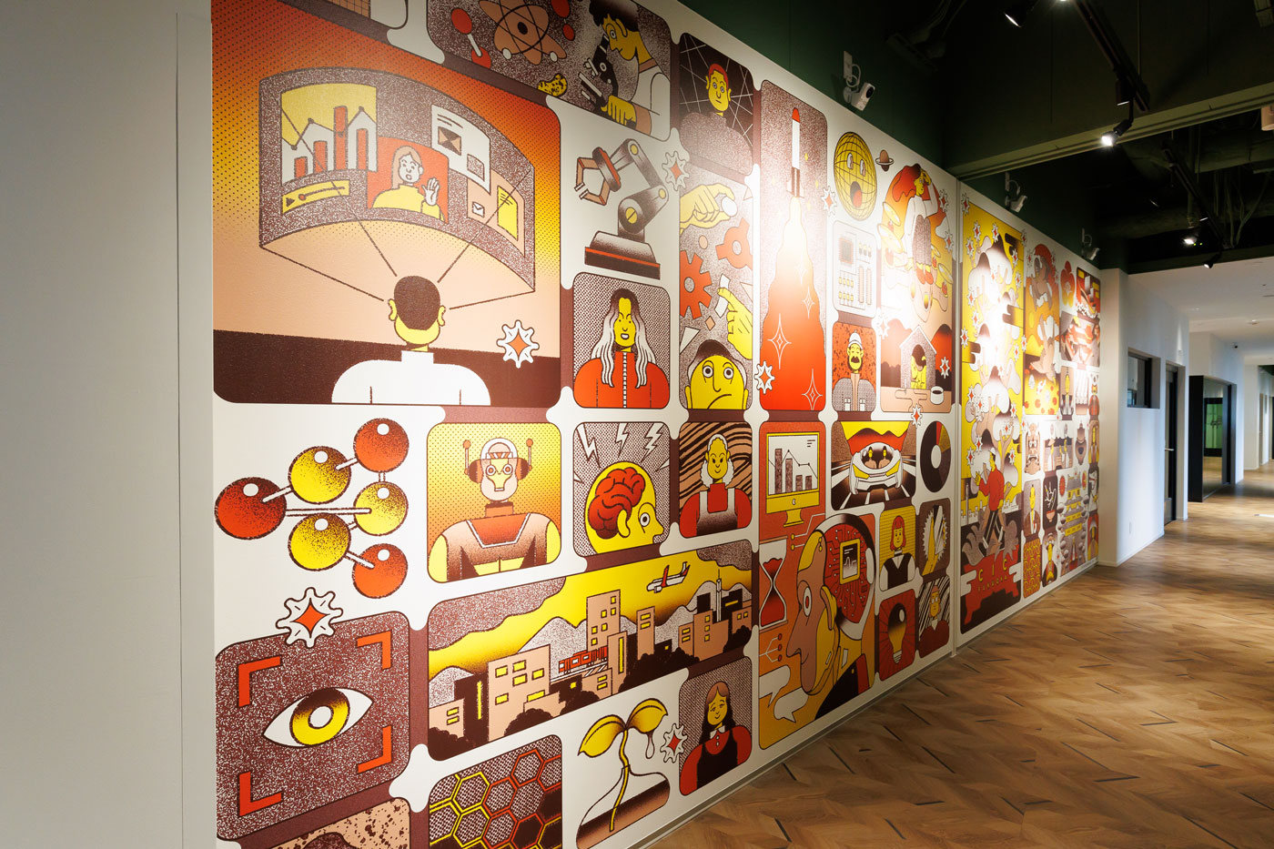 壁面のイラストは、福岡でグラフィックデザイナーとして活躍した経験を持つ仁太郎さんの描き下ろしです。福岡ゆかりのアーティストによる作品を、館内の随所に採り入れているのも「CIC Fukuoka」の大きな特色なんですよ。