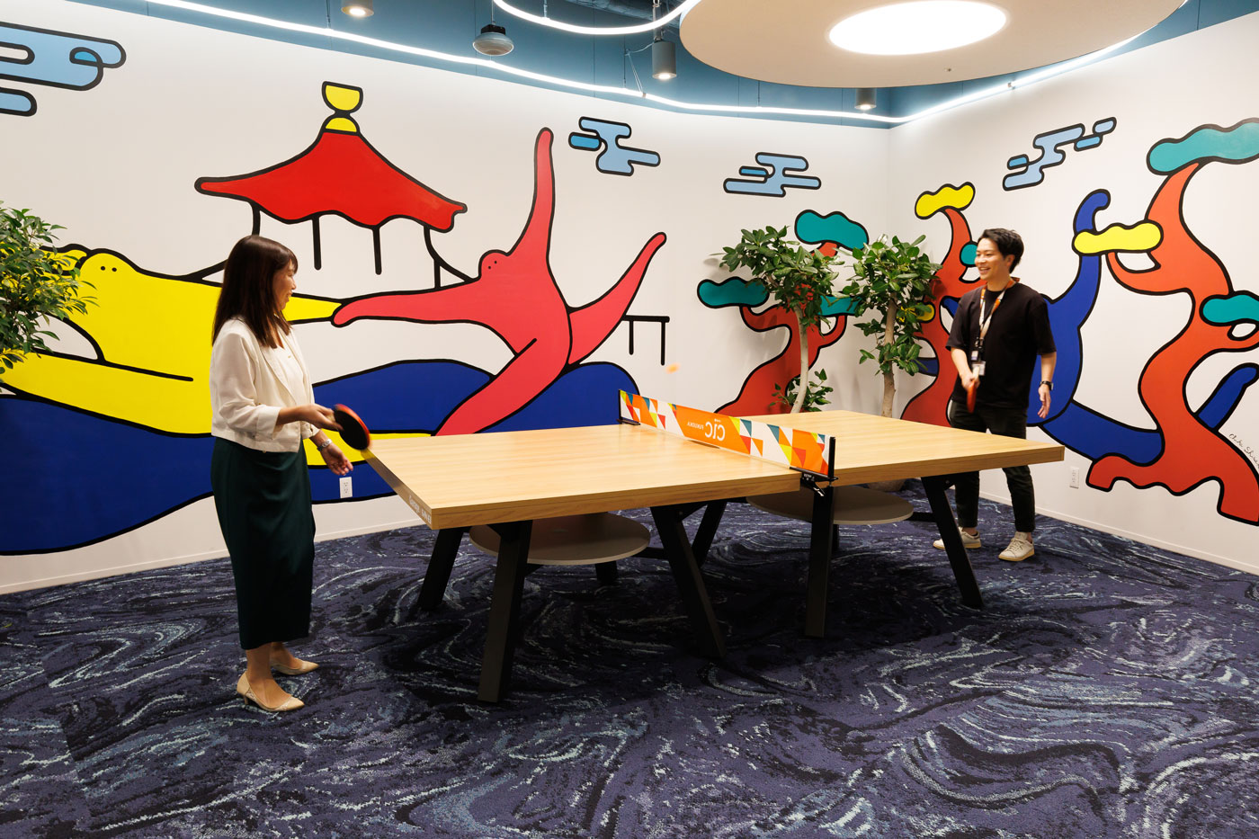 仕事の合間にここでリフレッシュできます。ゲームスペースもあって、ここでは会社対抗戦や個人戦が開催されることもありますよ。ゲームを通じて知り合う入居者さんもたくさんいるみたいで、CICらしいですよね。