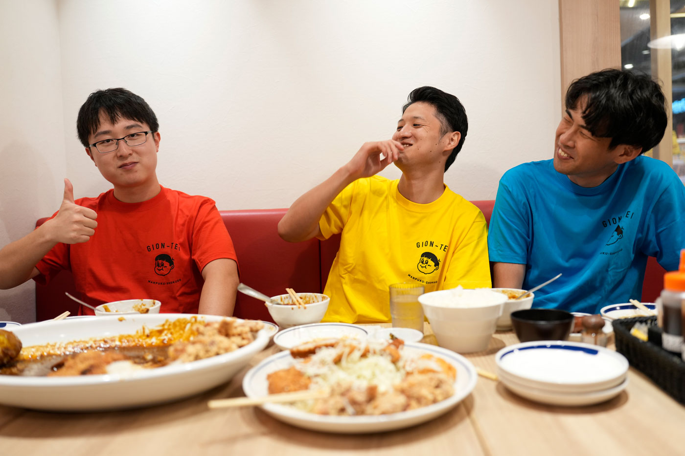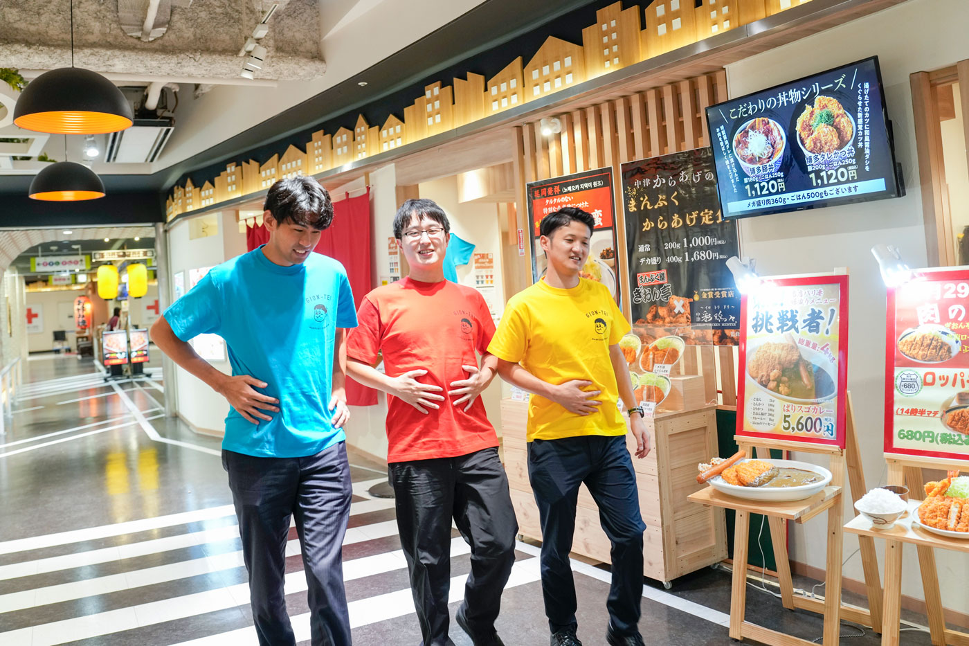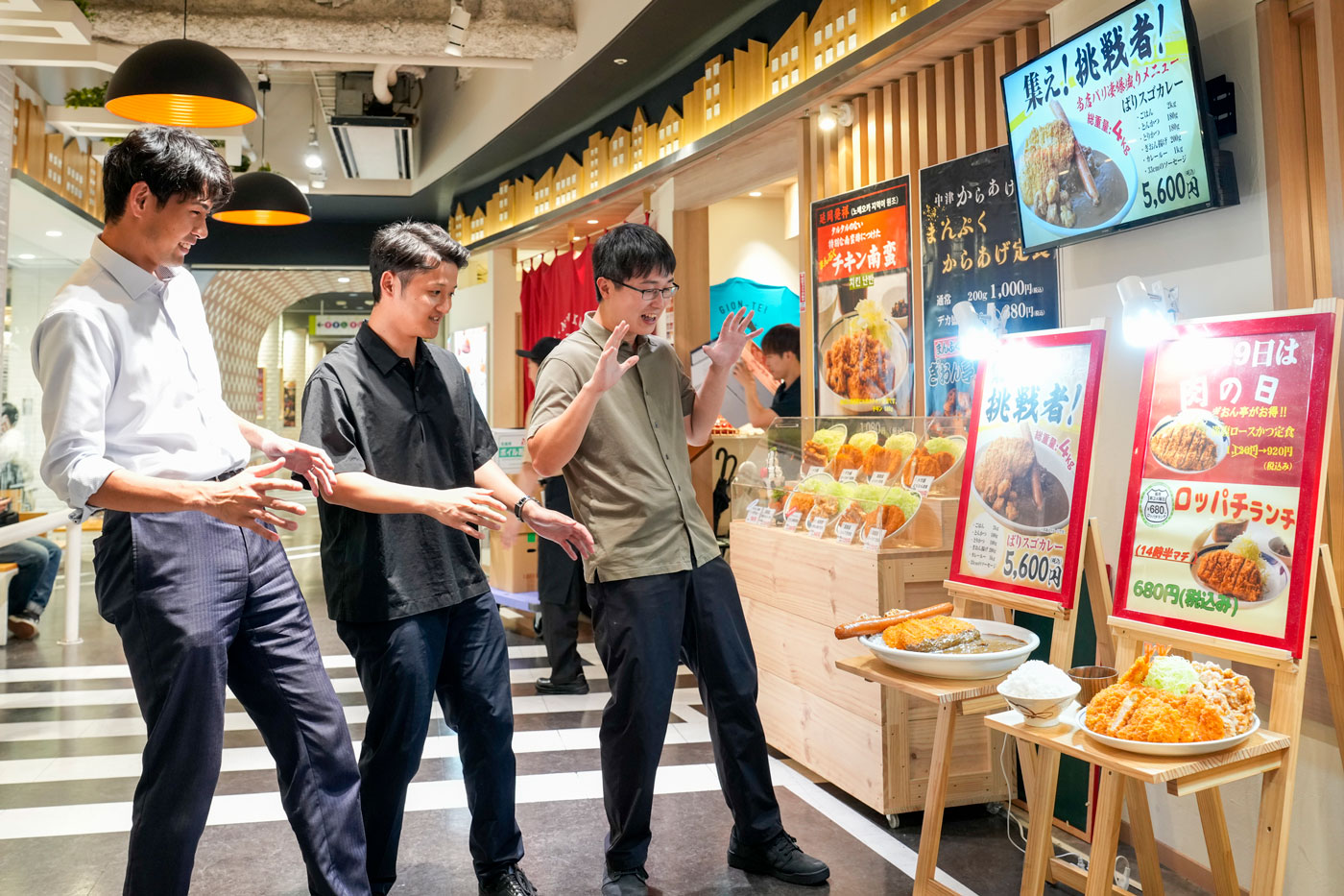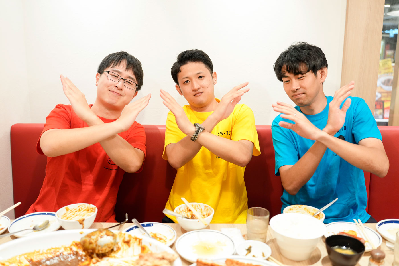 今回デカ盛りメニューに挑戦するのは、西鉄の自動車事業本部技術部の折田恭滉さん、沿線開発事業本部ビル・SC事業部の金丸絋大さん、海外開発事業部の金智元さん。食べるのが大好きという若手たちは、メガ盛りメニューを制覇できるのか……?!