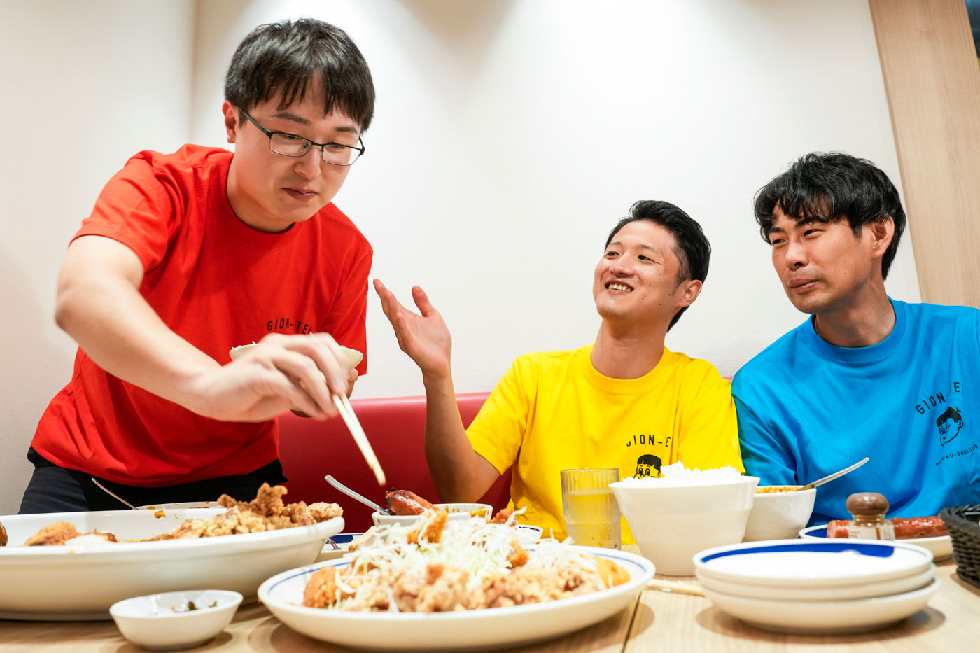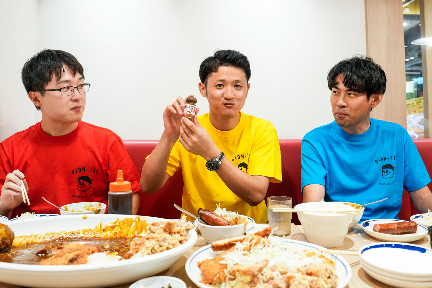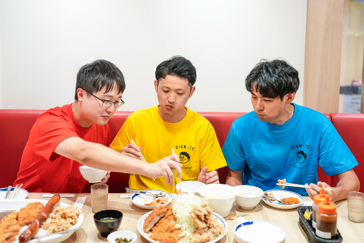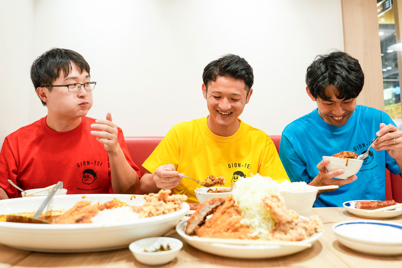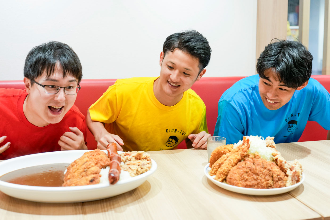 今回デカ盛りメニューに挑戦するのは、西鉄の自動車事業本部技術部の折田恭滉さん、沿線開発事業本部ビル・SC事業部の金丸絋大さん、海外開発事業部の金智元さん。食べるのが大好きという若手たちは、メガ盛りメニューを制覇できるのか……?!
