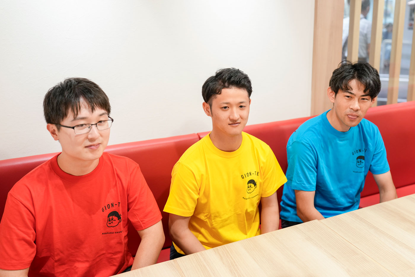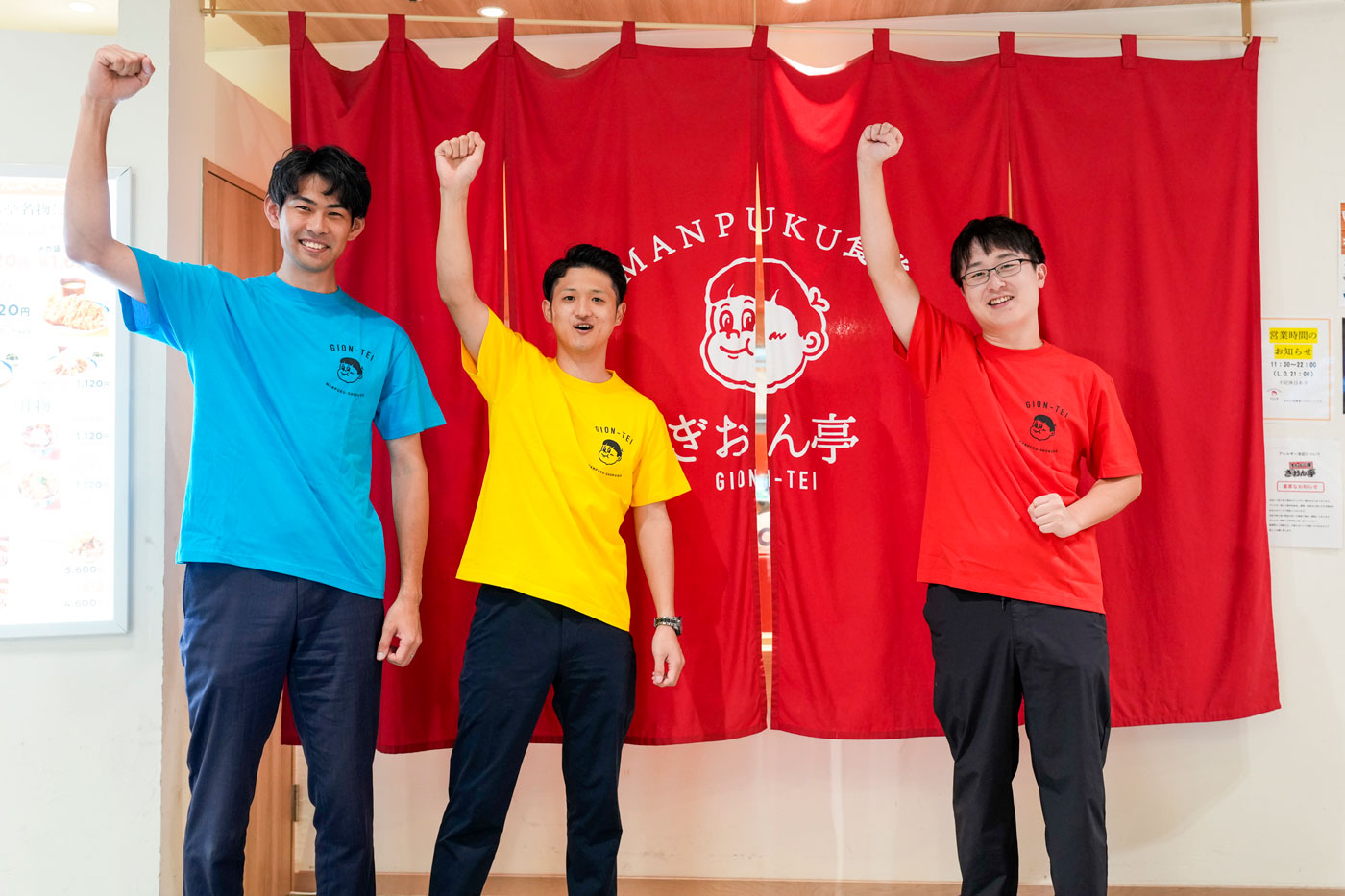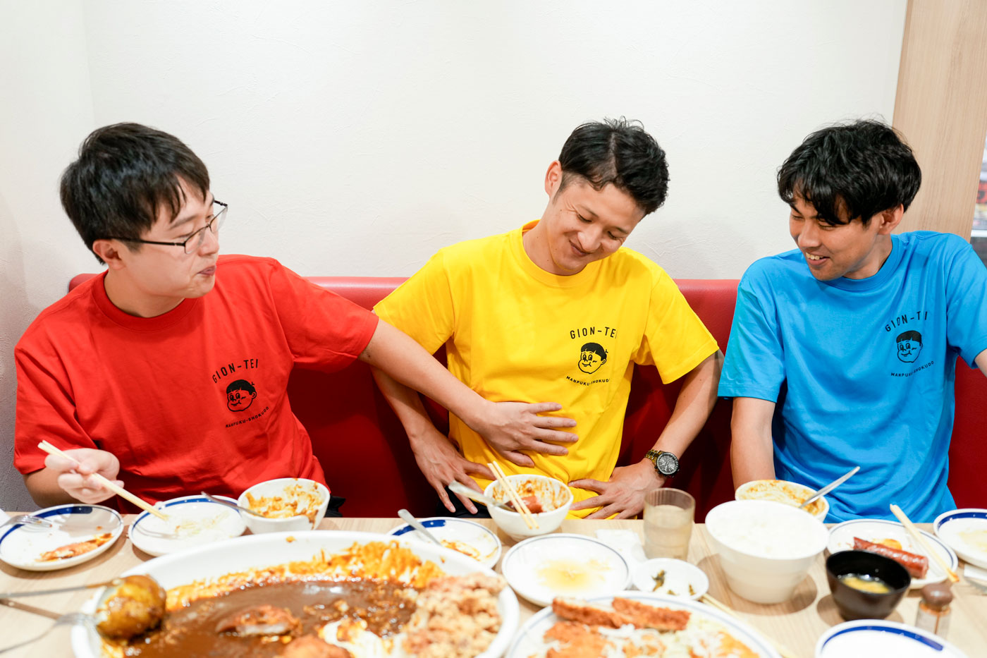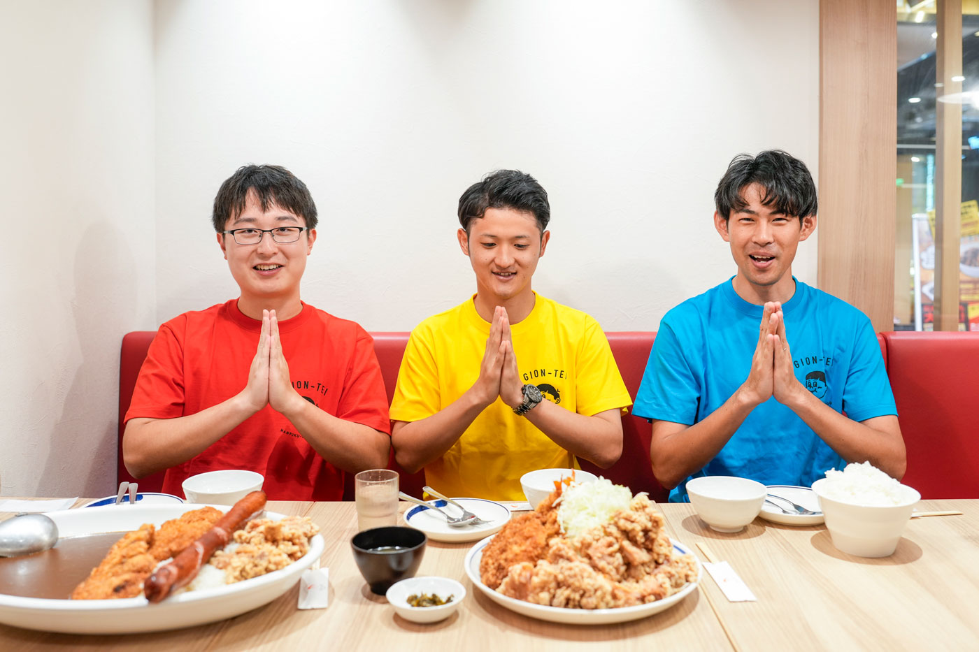 今回デカ盛りメニューに挑戦するのは、西鉄の自動車事業本部技術部の折田恭滉さん、沿線開発事業本部ビル・SC事業部の金丸絋大さん、海外開発事業部の金智元さん。食べるのが大好きという若手たちは、メガ盛りメニューを制覇できるのか……?!