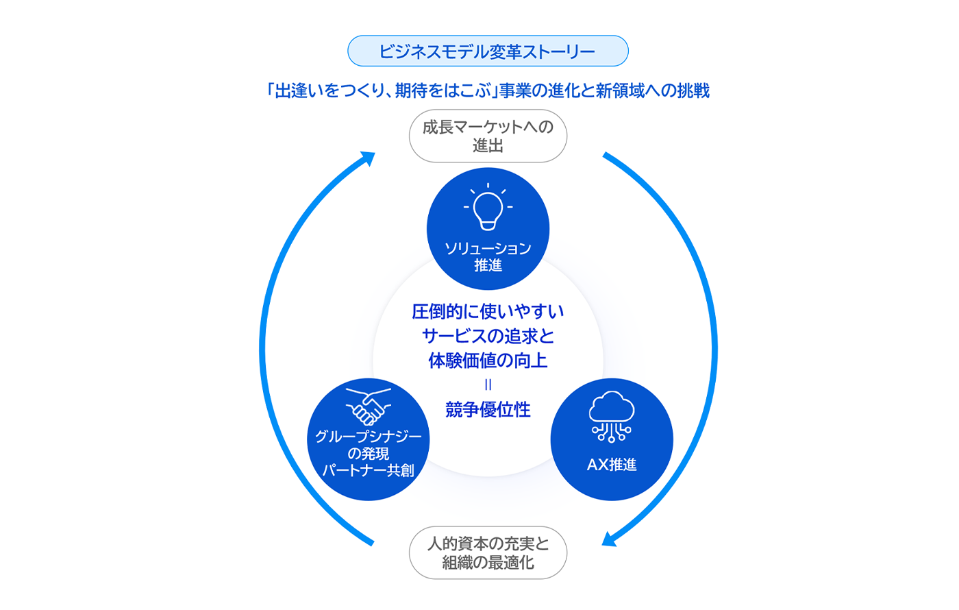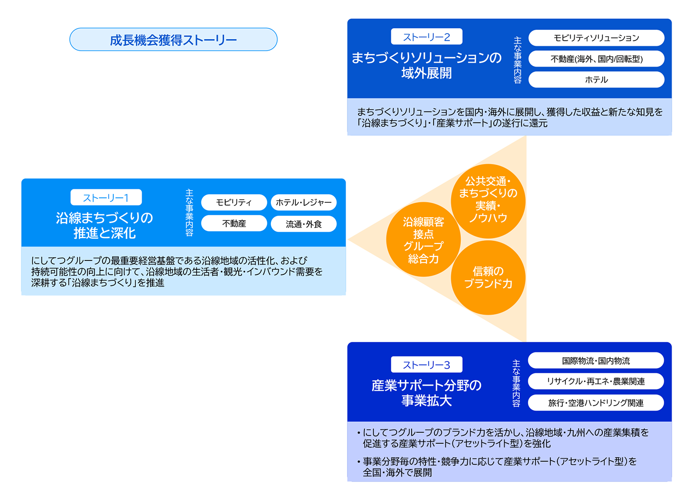 「成長機会獲得ストーリー」の推進により、にしてつグループの強みである「公共交通・まちづくりのノウハウ」「沿線での幅広い事業を通じた顧客接点」これらにより築かれた「信頼のブランド力」と「グループシナジー」を最大限に発揮していく。