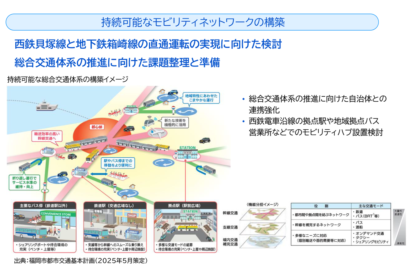 モビリティネットワークの面では、西鉄貝塚線と地下鉄箱崎線の直通運転の実現に向けた検討を進めるとともに、総合交通体系の推進に向けた自治体との連携を強化する。