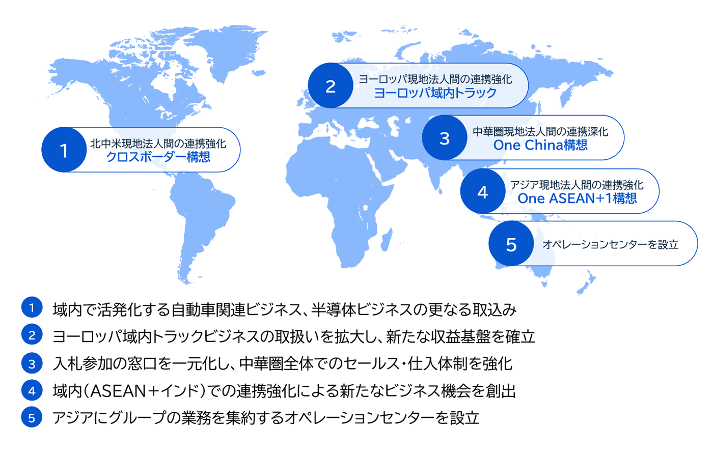 「海外ネットワーク」については、市場拡大を目的としたM&Aの推進に加え、駐在員事務所の現地法人化や新規拠点の展開を進め、グローバルな物流網の拡充を図る。